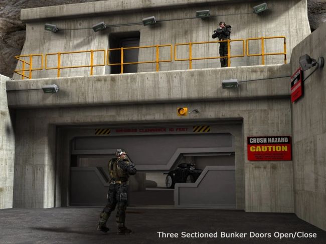 The set boasts high ceiling allowing for large vehicle transport storage possibilities. There is a guard's overlook area with guardrail, and a small personnel sized door and small corridor to suggest a path to somewhere.