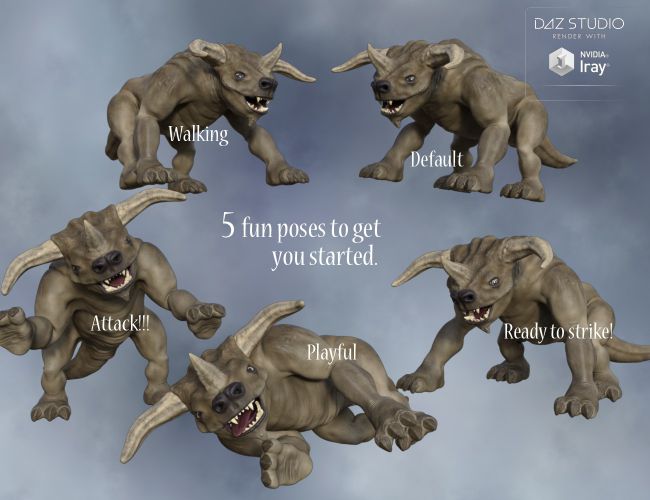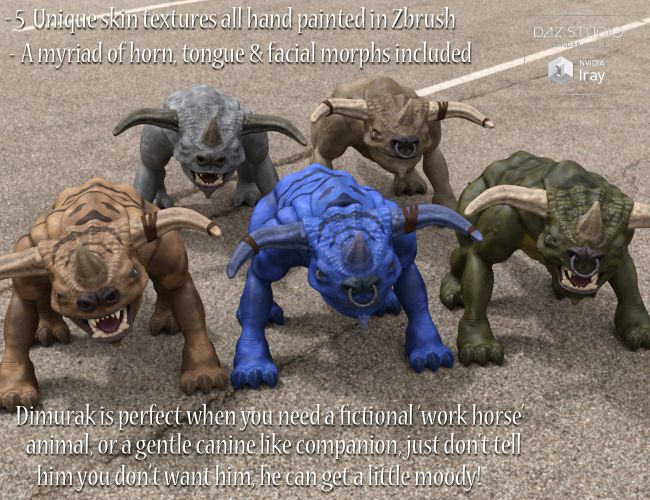 Like a giant puppy dog the Dimurak are friendly when treated well but can be aggressive when threatened. He loads with Iray materials as all his props do but of course I've included the matching 3Delight files too, Poser users can use Dimurak easily as I've included all the necessary native Poser files.