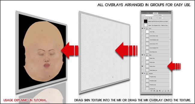 Skin Overlay Merchant Resource for V5 and M5 skin sets contains .PSD files with easy to apply layers giving you instant Aging and Blemish results. Each overlay type contains its own group with source files, as well as presets and easy to follow instructions of how to modify and apply, making 3D model skin editing easy.