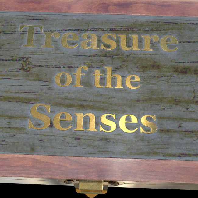 The entire box is elegantly textured in wood, with the lid also boasting a luxurious metal-inlaid text: "Treasure of the Senses".