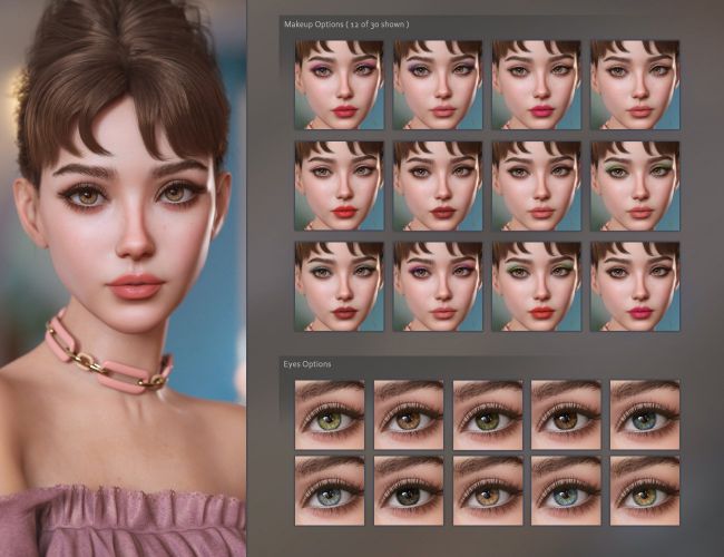 Her customization options include eleven eye colors, fibermesh eyebrows, thirty makeup styles, two eyelash types (natural and glamorous), long nails, French nails, fourteen nail polish colors, a custom head morph, a custom body morph, and three unique expressions: smile open, smile closed, and sultry.