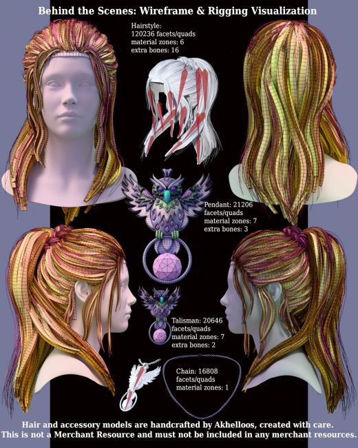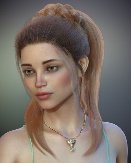 Alexeia Hair features a sleek, high ponytail secured with a beautifully braided hair tie. Delicate tendrils gracefully cascade from the temples and sideburns, enhancing the natural and flowing look. The hair is conforming and rigged on three parts of three bones each, allowing for small adjustments to posing, if needed. It comes in two versions: one where the ponytail is conforming to the figure for effortless use and its bones can be used for further pose adjustments if desired, and another version where only the head and neck conform, allowing the ponytail to be posed only with bones for greater styling control. As a bonus, Alexeia includes a mystical owl pendant adorned with shimmering gems and a matching forehead talisman, perfect for fantasy characters.