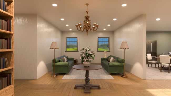The study area includes built-in bookshelves, a stylish desk, and layered lighting, perfect for storytelling or professional renders.