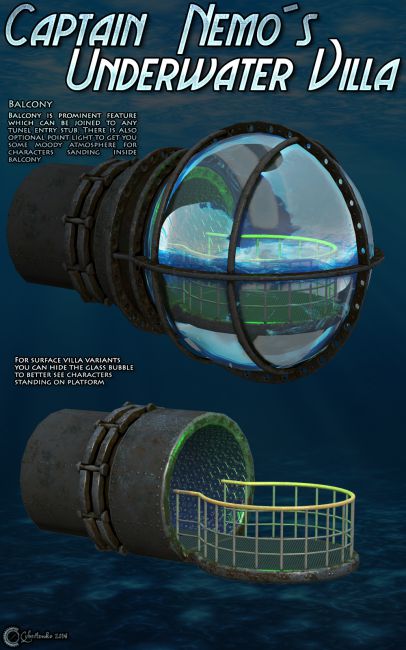 Captain Nemo´s Underwater Villa is universal construction kit for making all kind of Victorian style or steampunk style underwater bases and structures. It consists of several poser figure items for building or modules, where some complex movement is needed. All other parts are made as poser props or props collections. It is a very versatile and complex products, suitable for almost any kind of project oriented bellow water surface. You may use it for historical projects, pirate fantasy, past present or future war scenes, adventure, sci-fi and futurustic vision and even for romantic scene of mermaids, sirens, lost sailors and so on. Accept my invitation bellow sea surface into some most sofisticated and intrigue underwater adventures!