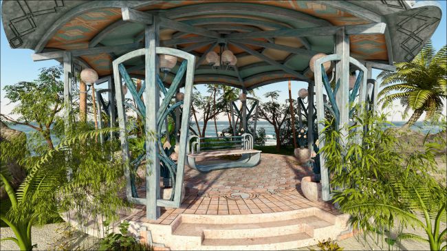The unique brand of Art Deco architecture and decorative arts that graces the South Beach neighborhood of Miami finds elegant expression in the South Beach Deco series of scenes and props, as seen in this romantic tropical outdoor Pavilion.