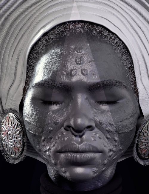 Ashanti features a beautifully sculpted head and body shape, detailed hand and foot morphs, and custom FiberMesh eyebrows. Her realistic, deep-toned skin, a wide variety of expressive eye colors, and unique ethnic markings inspired by her ancestral roots make her a truly one-of-a-kind character for Genesis 9.