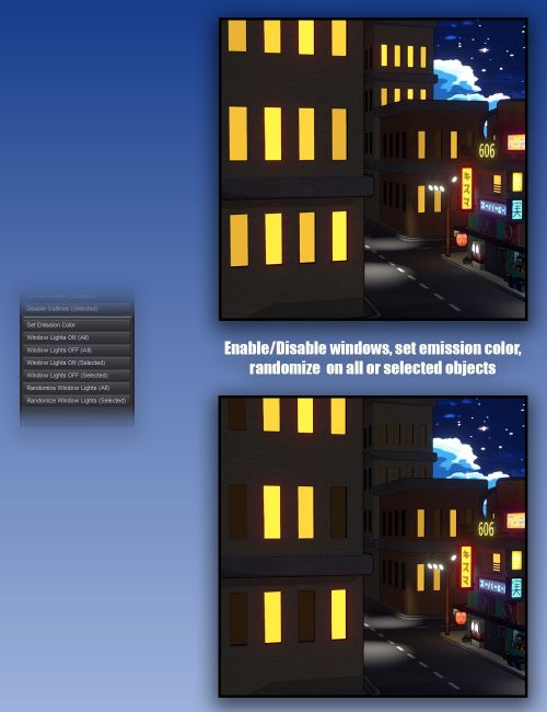 - Randomize Windows - Randomly enable/disable emission for the windows of the city for unique renders