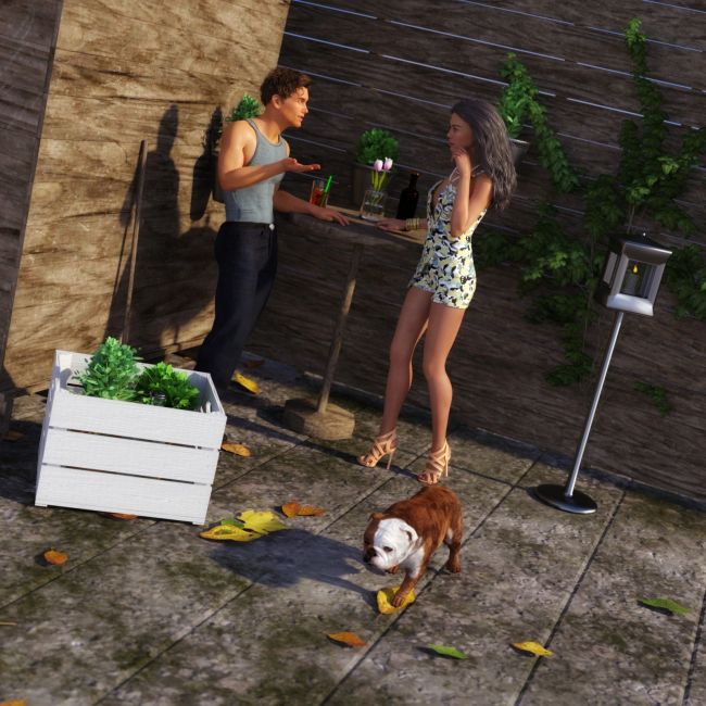 You've always dreamed of a little bar in your backyard where you'd like to party from time to time.With this set you can try it out virtually. Let your characters celebrate their birthdays there, or simply enjoy a snack or a beer at the end of the day after a walk with the dog. Because the dog is also taken care of. There is a resting place for your four-legged friend under the small raised bed on which you can also sit well. Small plants, climbing ivy and greenery in vases and small pots create a homely atmosphere. Numerous props, such as candles, glasses, bottle openers, feeding bowls and toys for the dog and much more ensure varied scenes. Everything with a lot of material and thus quick life in your scene comes with many suitable poses for Genesis 8. Finished scenes, camera and light sets are also included. Have fun with this elaborate and lovingly equipped set.
