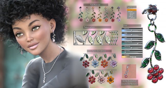 You can apply the metal options (silver, silver-dirt, gold, light gold, antique and bronze) with the full material presets, while the rhinestones (ruby, rose, purple, green, amber/topaz/peach, aqua), can be applied separately with the partial material presets, so you can mix the styles to your taste. There are also included some patterns as partial presets, making the simple metal part more unique.