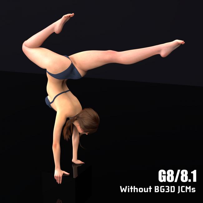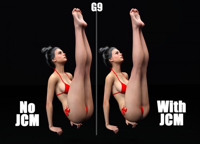 I have provided 3 Automated Pose Morphs when making poses on the fly; as well as, the Manual Correction morphs for the thigh/hips when used with 3rd party poses. Utilize these correction morphs to smooth out these areas as the G8 doesn't bend well when using the Bend/Side-Side together; leading to distortions in the hip/thigh. I have made specific manual JCMs to correct these troublesome areas.