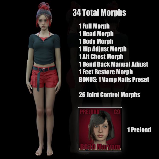 For the moment Maryam is Exclusive to the G9 Figure. I have not decided to port this character over to G8F at this time, but be on the lookout for the G8F version of Maryam to be released sometime later if I decide to do so.