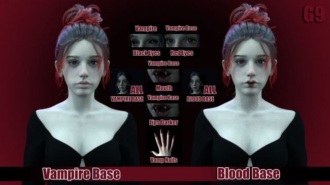 I have included a few textures options for Maryam, including 4 separate PBR IRAY skin hierarchical settings for Maryam. The Hierarchical Skin settings will load all texture for the main base G9 figure and the attachments (eyes/lashes/mouth/tear); as well as, the Vampire versions of Maryam. There are two SKIN options for the VAMPIRE VERSION and all options can be found in the provided separate Vampire Texture folder.