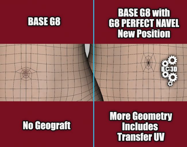 I have created a separate UV for the G8 Perfect Navel (v1.0). This will allow the creator to manually create new skins for the Navel if the buyer knows how to use the DAZ transfer tool, and fix the seams in an editor. For the moment i am working on a script that will allow the user the ability to transfer the skin more easily. Unlike the G9 version, where I had to add geometry, the G8 version I had to remove and then re-add geometry. In future addition I will rework this, if the need arises.