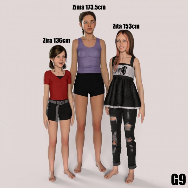 My 3 in 1 Exclusive Pack of BG3D Sister's of Z for G9 is now available for the Genesis 9 Figure. This exclusive Genesis 9 Pack includes 3 characters, 3 female versions named Zima the Adult (Base Figure), Zita (Teen) and Zira (Child) Characters.