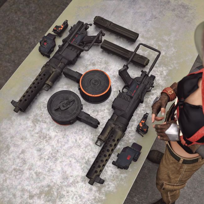 An imaginary German submachine gun from an alternative reality (and a famous game). The look is based on many real guns like MP 40, Schmeiser and others. includes 2 mags- regular straight one and a drum for higher capacity. Rigged and converted for use with DAZ. Trigger, safety, bolt, etc also rigged for more realistic pictures. Also includes a futuristic red dot for funs and various porpoises and pictures (can be hidden and used as a regular rifle). The stock is folding.