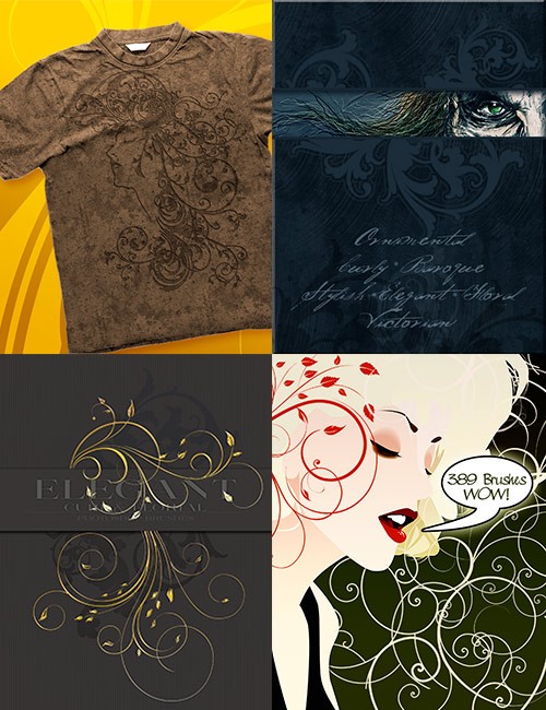 High-Resolution Photoshop brushes of flourishes and gold layer styles.