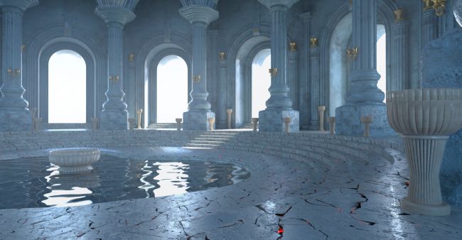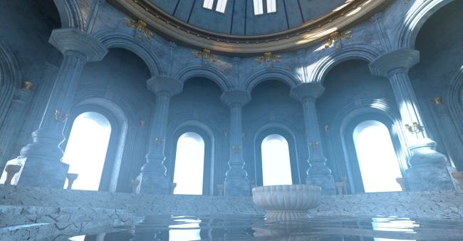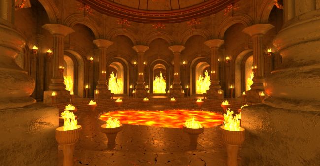 This product features large, classically styled columns with fluted shafts, and a series of semicircular arches surrounding the room, allowing natural light to enter from the outside. At the top is a dome with decorative reliefs and small windows. The dome is independent, allowing it to be concealed to allow another light source to enter. You will find floor and wall/column firelighters, as well as candles, which are included as separate props. Using the included light-emitting materials, you can turn the flames on or off. The water and magma elements are also separate objects that you can conceal as you wish.