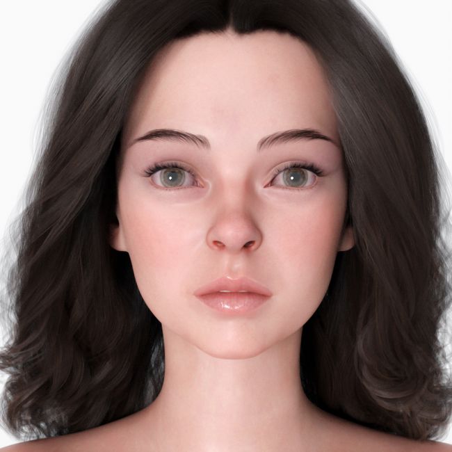 Her eyes are large and clear, a greenish-grey, staring straight ahead with a calm, neutral, and slightly wistful expression. Her eyelashes are naturally curled, while her eyebrows are thin, neat, and gently curved to follow the shape of her face. Her nose is small and delicate, paired with thin, naturally glossy lips, which add a feminine and soft feel.