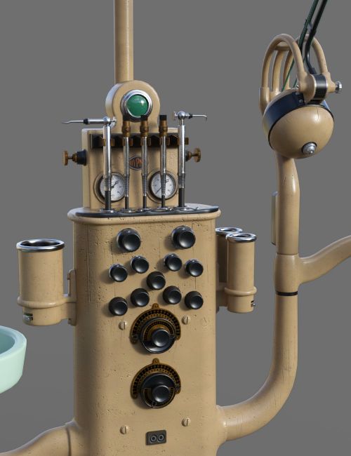 Dentist chair and workstation props. Step into a bygone era with this intricately designed dentist chair and workstation, where industrial precision meets art deco elegance. The dentist chair commonly seen in dental clinics from the 1930s to 1960s era is rigged for full functionality and can be adjusted to many positions to fit the person sitting in it and adjusted to optimal working positions. Included in the set are convenient chair poses for upright and reclined positions as well as a footrest tilt position. Featuring along side the chair is the dentist workstation, combining multiple tools together on a conveniently accessible tower, rigged elements include cuspidor, dials, drills, gauges, lamp, saliva ejector and tray. Wearable chair presets for Genesis 8 and 9 figures place them in a standard sitting position on the chair.