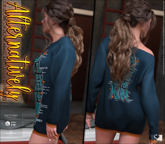 Alternatively is a brand new texture pack for LilFlame's dForce Roommate Shirt for Genesis 9 Female(s), with this pack you'll get 12 new fully detailed high-resolution texture styles. Use the Popups on the product page to see each style in full detail.