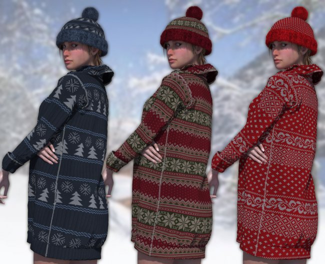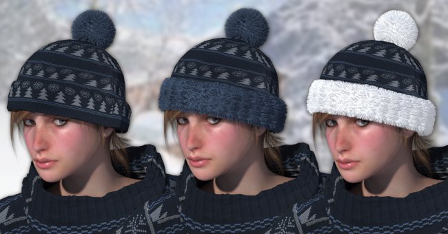 « Winter Cap » is a dynamic cap for LaFemme to use in Poser, and 3 new textures for the Winter Time sweater dress.
