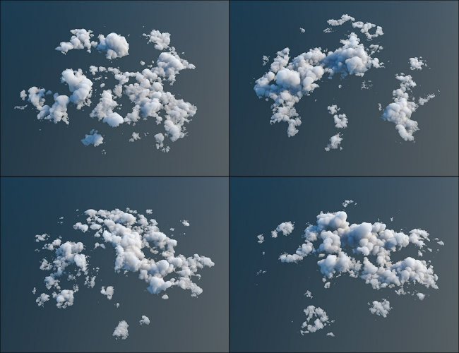 Each set contains 2 different types of clouds with 15 options each in both high and low-resolution variations. The 10 included material presets let you configure cloud density and brightness, while the additional preview material makes it easier to position clouds in your scene.