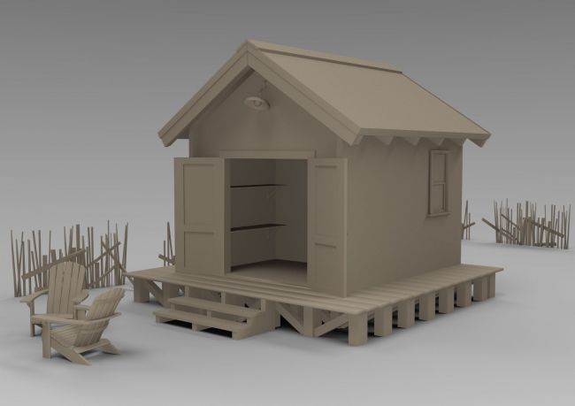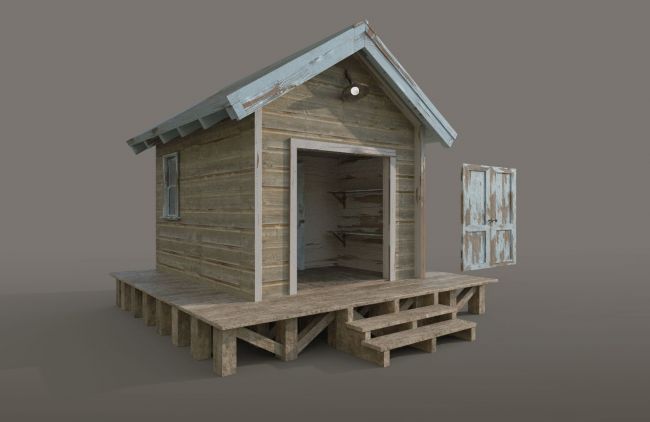 The cabin features aged wooden planks, distressed paint details, a functional interior with shelving, and realistic structural elements.