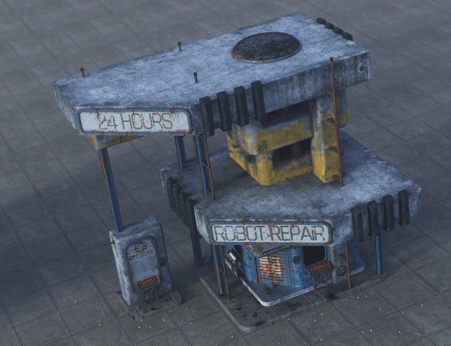 Do you need a quick and efficient low-cost repair for your robot buddy? Look no further.... The Robot Repair Shop is here. Beautiful brutalist-inspired sci-fi architecture with a plethora of details.