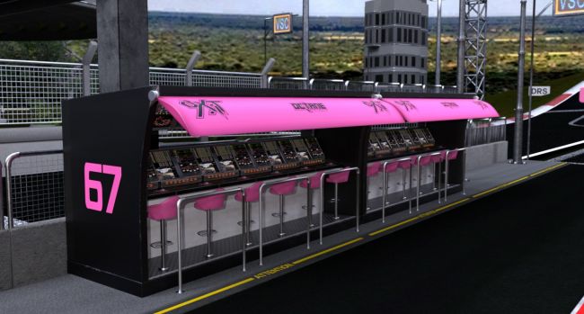 You will find two sorts of bleachers, the pit wall, a time tower, and, of course, the red light line. Twenty-two different flag materials for the flags waving on the roofs and two roof bars for the VIPs complete this Track scene.