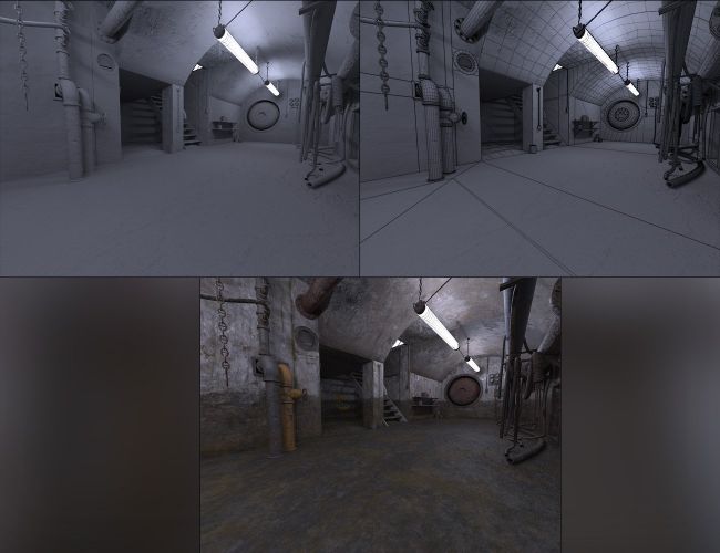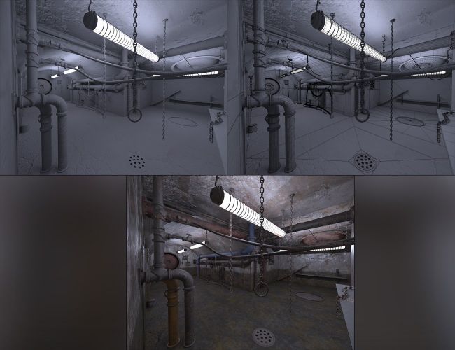 A creepy disused basement environment, complete with camera, lighting, fog and material presets.