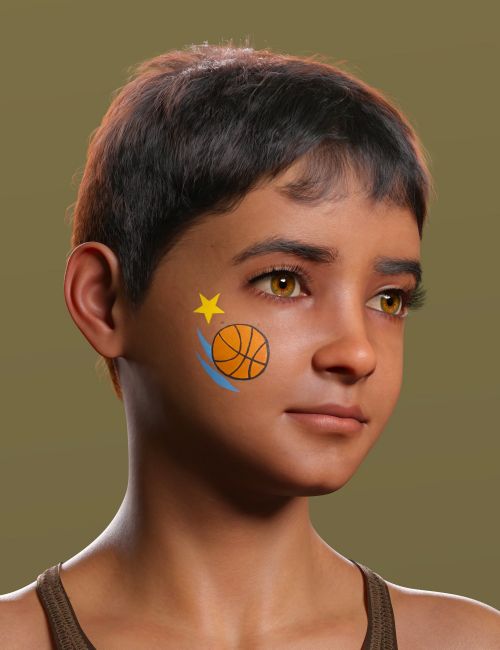 Elian features custom HD morphs, high-quality PBR skin shaders, and detailed textures that highlight the softness and realism of youthful skin. His look includes 7 iris colors (fully compatible with the original Genesis 9 Eyes LIE system) and 4 themed face paints — Kitty, Bolt, Basketball, and Soccer — perfect for playful portraits, creative renders, or fantasy storytelling.