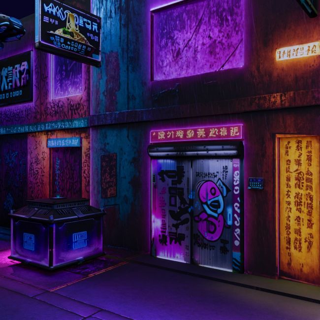 A narrow, neon-lit alley exists between towering skyscrapers, its walls plastered with flickering holographic ads in forgotten languages. The wet pavement reflects the pulsing glow of signs. Shadows move beneath glitching surveillance drones, and the distant hum of synth music bleeds through graffiti-tagged steel doors. It's a place where data dealers, rogue androids, and fugitives vanish into the electric gloom…