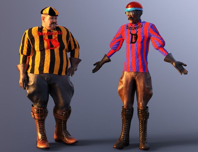 Vintage style clothing for stunt biker performing on carnival sideshows like Wall of the Death or Globe of Death. Clothing consists of padded striped dress with balloon sleeves, leather riding pants with high laced boots. There is also gloves and leather hood with helmet, along with goggles or simple peak hat in club colors for more options. Morphs for adjusting dress balloon sleeves are including for easier posing. Dress is dForce ready for easier posing. There are two color variants for most of items, dark and brown for leather items and red and blue or orange and black for club colors.