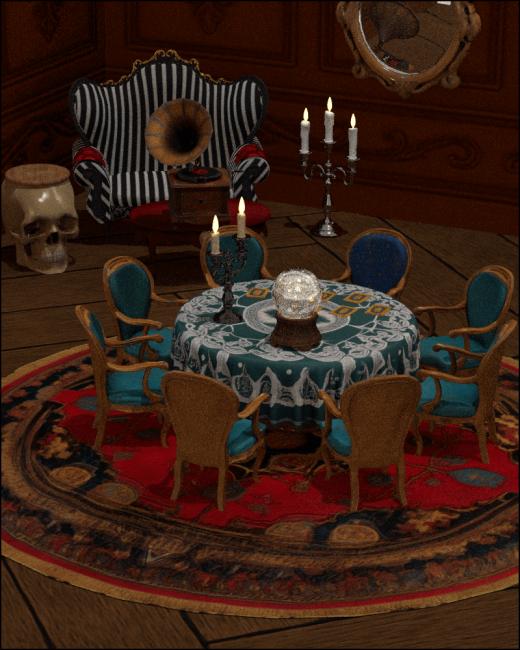 A 1920s parlor for seances and trickery - knocking walls and flying ghosts. Incluced a sofa with several material options, a coffee table with a decoration you can change, a rug, a seance table, table cloth, crystal ball, tarot cards, a skull end table, and a double and triple candle holder.