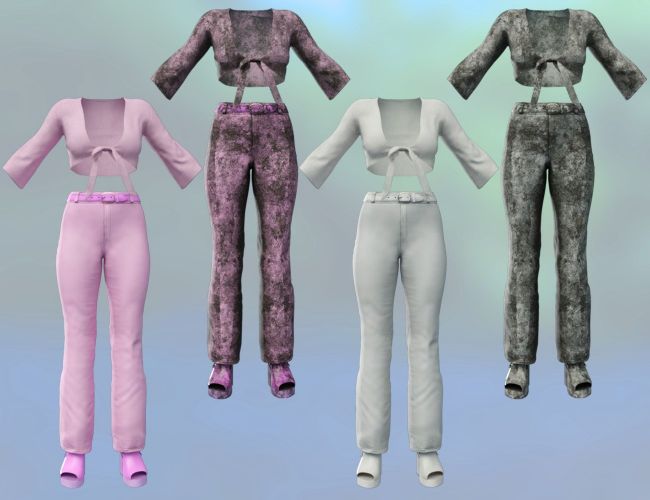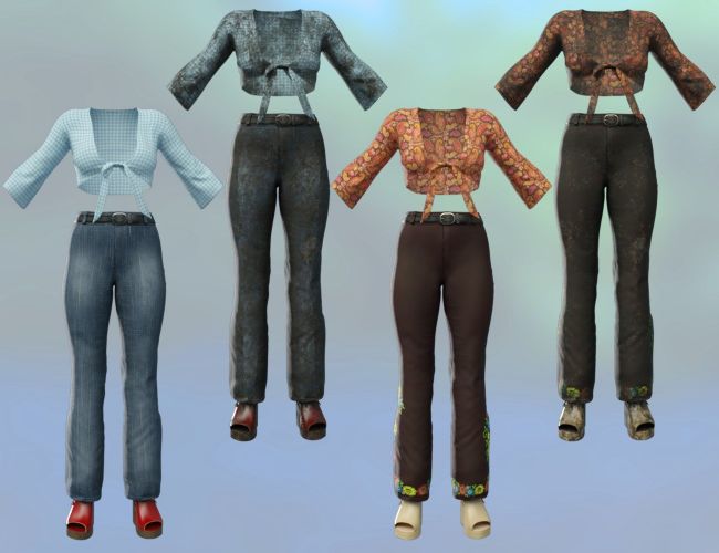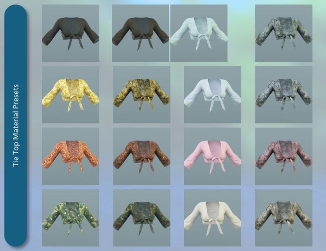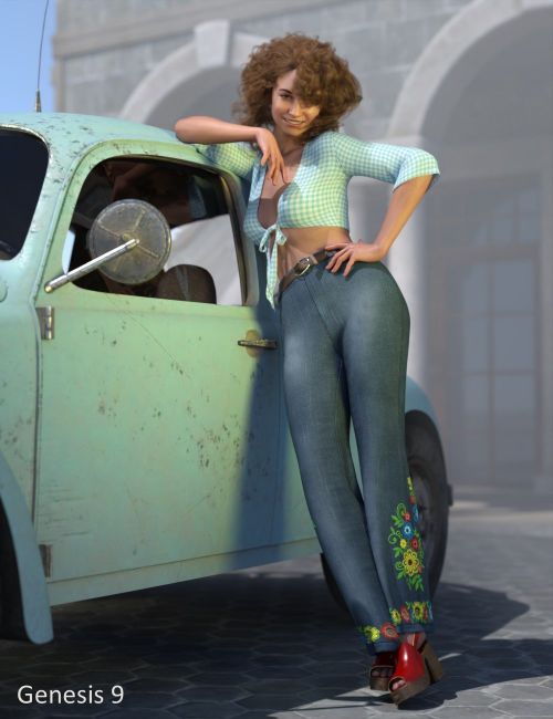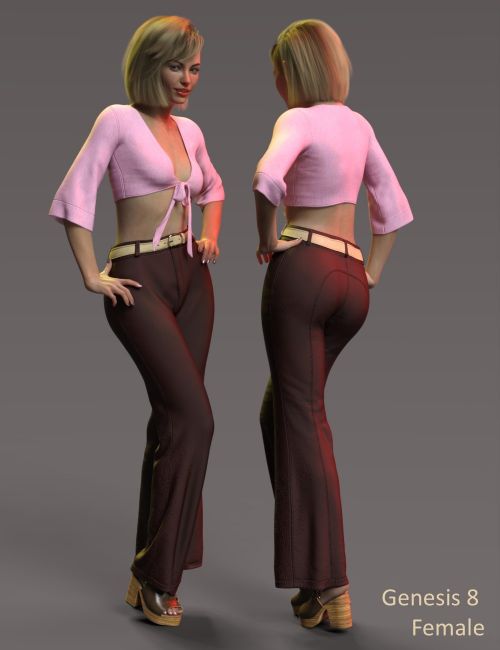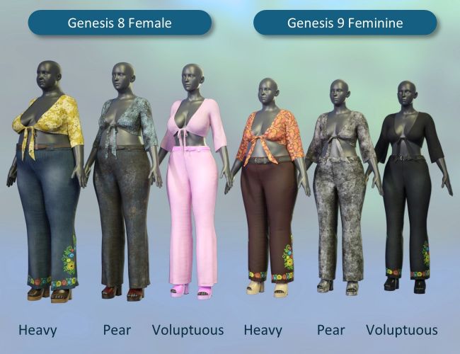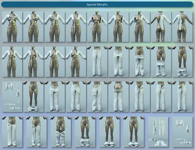 Several shaping and adjustment morphs are included to help fit many shapes and poses. Special morphs allow the Jeans and Tie Top to be shaped as if they're off the figure, intended for use when the items are not fitted to a character.