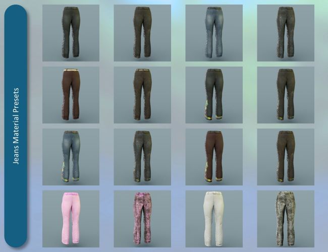 Hierarchical material presets allow you to change the look of the entire outfit, while additional material and shader presets let you customize individual parts or selected surfaces. Worn or Dirty material preset,s and Tattered opacity options add extra retro realism.
