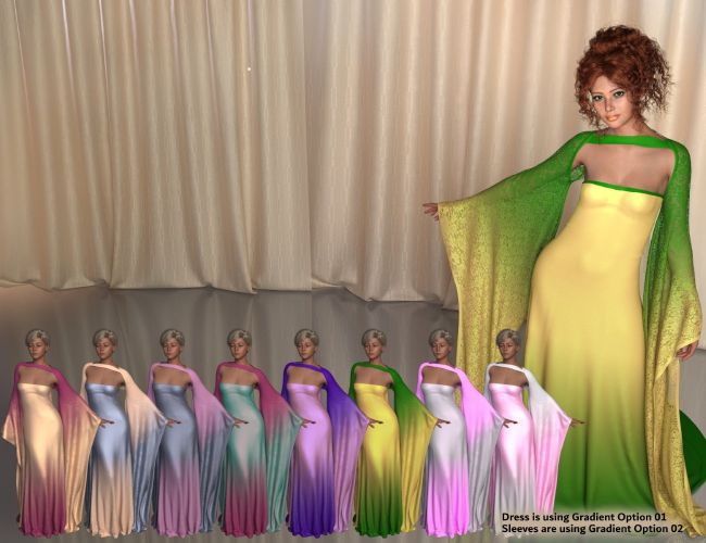 dForce Daphine Outfit for Genesis 9 also comes with many options for the Gown, Sleeves, Heels and Earrings.