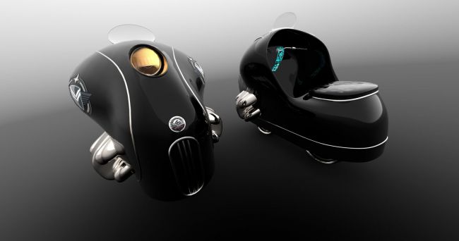 Bodywork: Smooth, rounded shapes reminiscent of 1930s luxury cars, with a metallic finish.