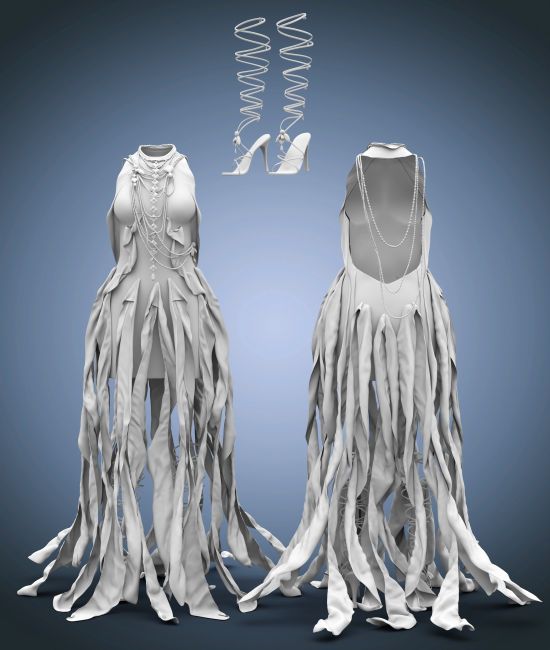 dForce Enchanting Ethereal Outfit for Genesis 9 is a jewel-encrusted dress with flowing translucent materials similar to the look of a jellyfish. It comes with a set of heels with straps climbing the leg, pearl necklaces, and brooches.