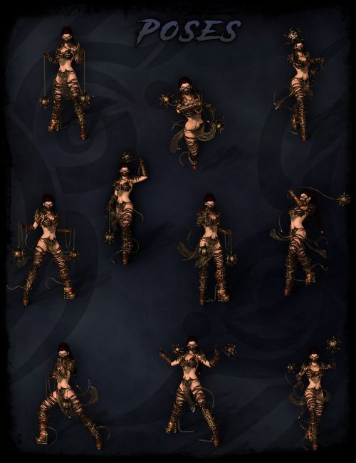 But I'm sure you're looking at all those chains, like "YIKES! I don't wanna pose that!" No worries, I have included 20 Poses that pose all the cloths and chains in warmongery splendor. All the dangling chain and cloth items also include easy pose dials, so you can easily make your own poses (or tweak the ones included)