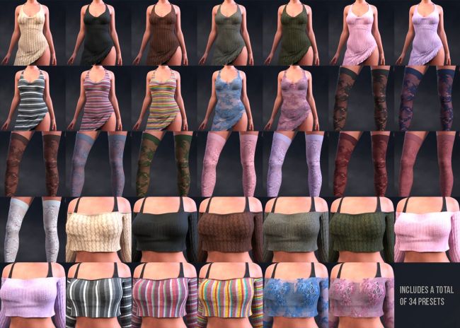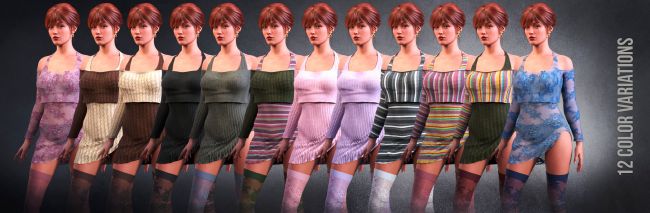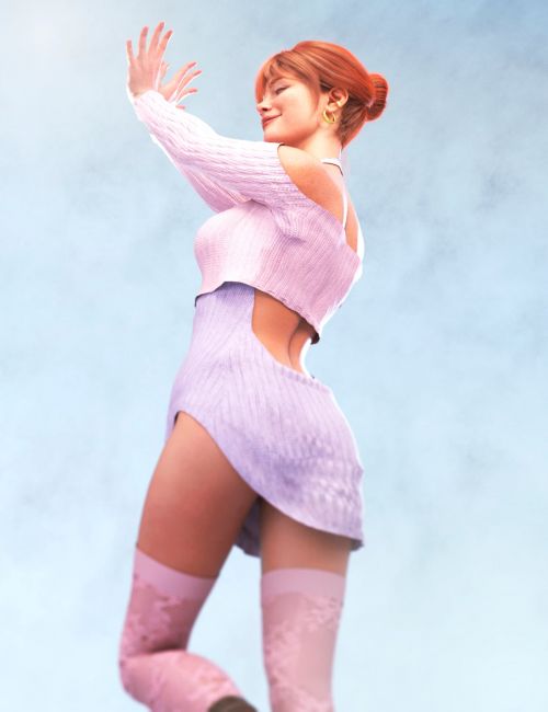 The dForce LA Knit Dress includes a 3 piece outfita vailable for both Genesis 8 and 9 females consisting of a mini skirt dress, top and stockings.