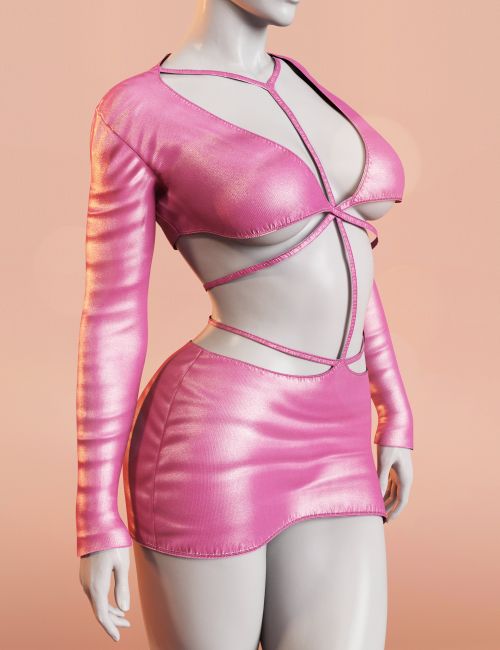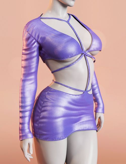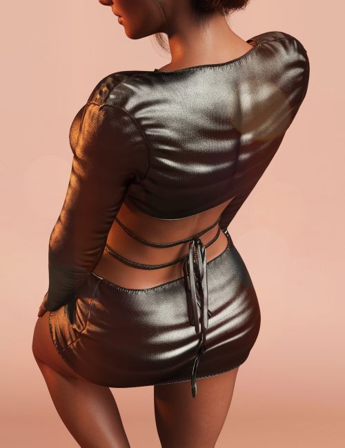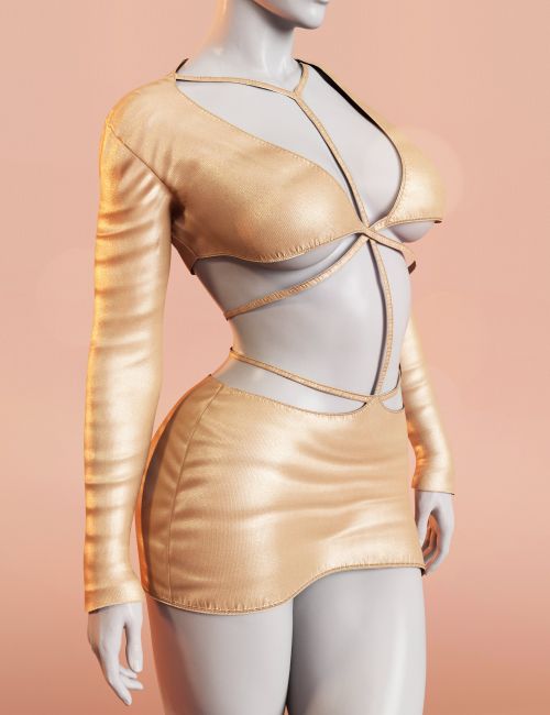 With its striking cutouts and intricate strap details, this dress frames the silhouette with confidence and allure, while the long fitted sleeves balance the boldness with a touch of refined edge. Its shimmering fabric flows naturally over the figure, ensuring every render radiates glamour and intensity.