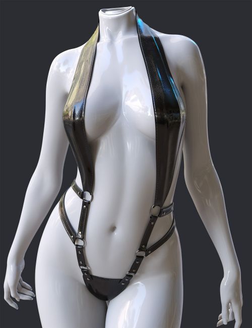 dForce Pure Fusion Suit for Genesis 9 is a bodysuit with straps and rings, adorned with rivets and can be also used as a swimwear.