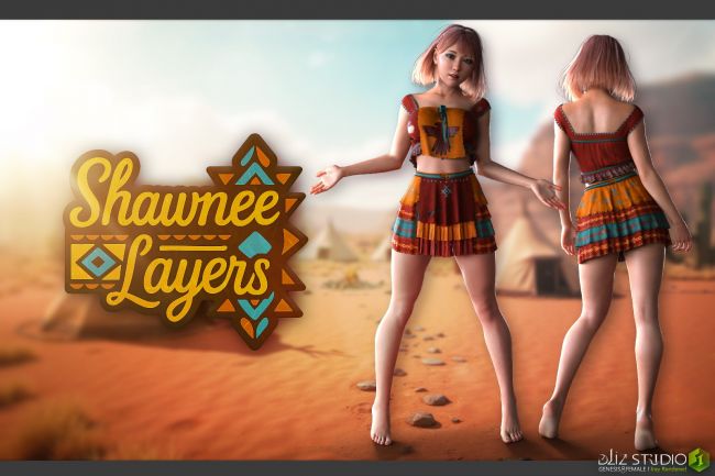 A layered ceremonial outfit for Genesis 8 Female(s), inspired by tribal and indigenous aesthetics. This set includes dynamic dForce-enabled garments with modular layering and symbolic material presets.