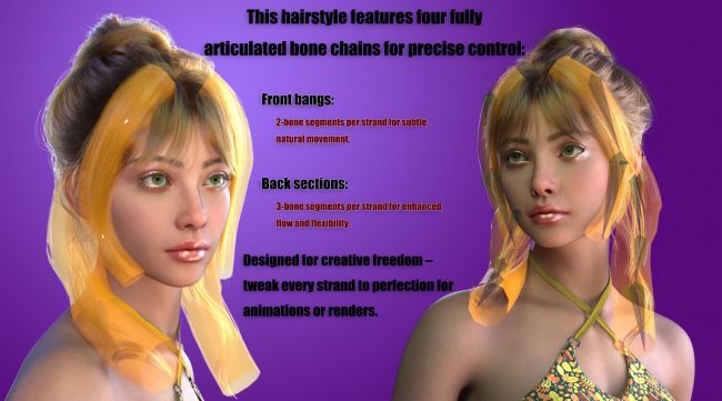 It includes 60 hair colors, 3 styles,10 bangs styles,4 blowout styles and 23 adjustment morphs.
