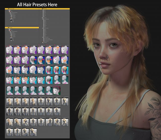 It includes 60 Base Hair Colors and 60 adjustment morphs. You can adjust them freely according to your needs to better adapt to the scenarios you require.
