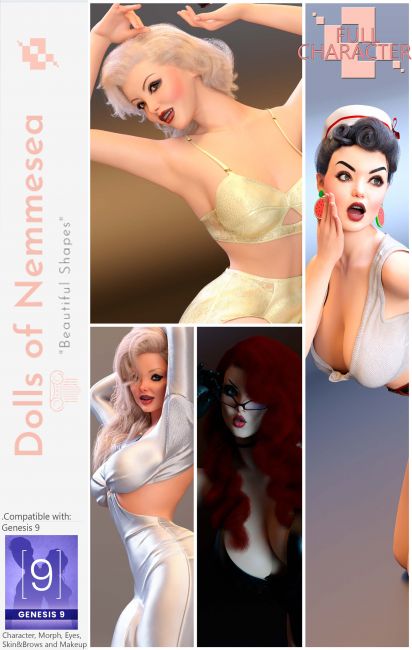 4 different head morphs inspired by American pinup women from illustrations and drawings by artist Alberto Vargas. The skins were created to give the most realistic effect possible, as close to a drawing or illustration. I only added a touch of realism with a single layer of micro-detail, Genesis 9, and a bit of gloss, to give a more realistic look to a fantasy doll.