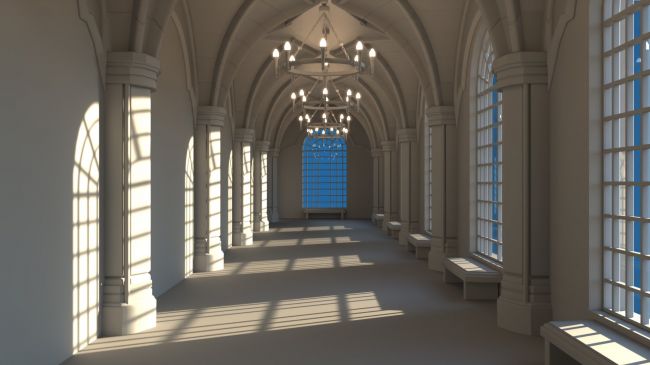 Featuring arched ceilings, stone textures, iron chandeliers, wooden benches, and grand windows casting realistic shadows, this 3D set evokes the ambiance of a castle passageway, noble stronghold, or ancient cathedral hall.