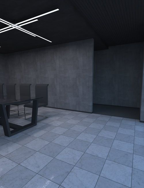 Dystopian Dining Room features a detailed sci fi minimalist theme interior scene with chairs, tables, wall decor, and unique ceiling lights, Optimized for Studio with Iray.