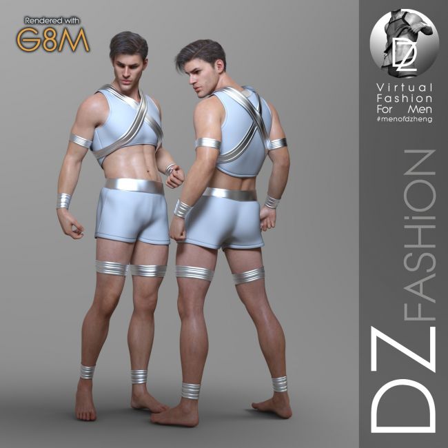 Aegis Form for Genesis 8 Male is a bold and stylish clothing set designed for fantasy, sci-fi, or high fashion renders. This set includes a criss-cross crop top, fitted mesh shorts, wrist cuffs, armbands, thigh straps, and ankle bands. It comes with 8 unique material presets and multiple material zones to let you mix and match different metallic and mesh styles.